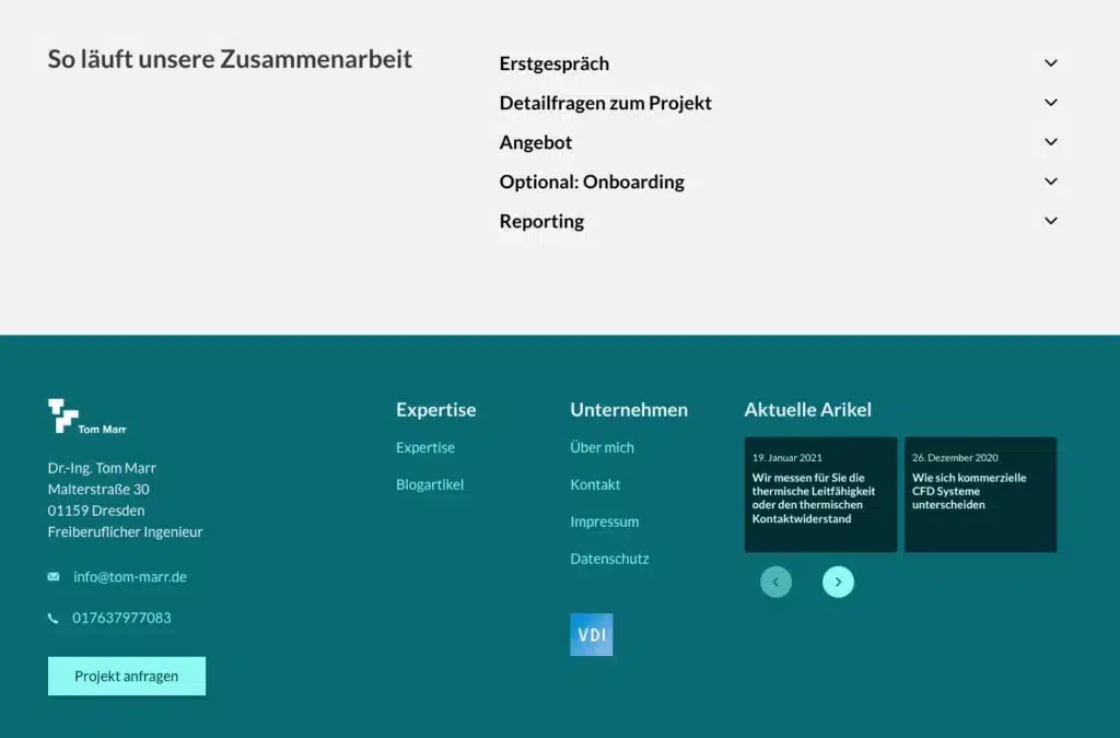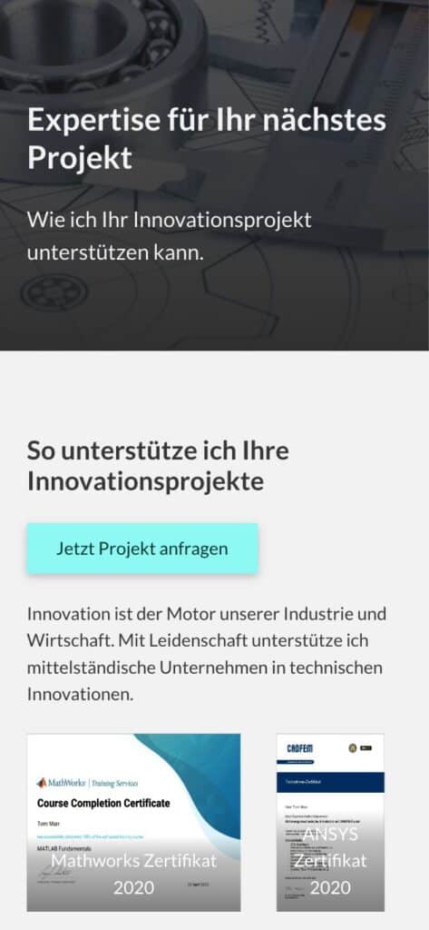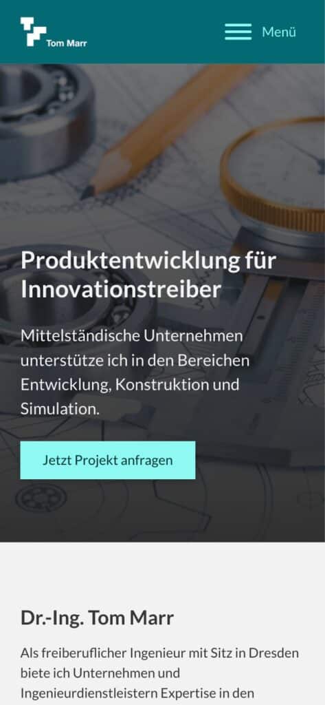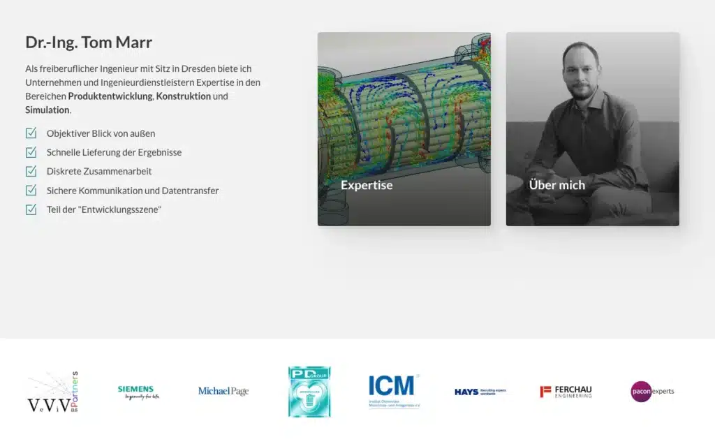 Dr.-Ing. Tom Marr ist Experte auf den Fachgebieten Strömungsanalyse und Werkstoffprüfung. Der Ingenieur mit Sitz in Dresden war auf der Suche nach einer Webseite, die seine Expertise unaufdringlich sichtbar macht.
